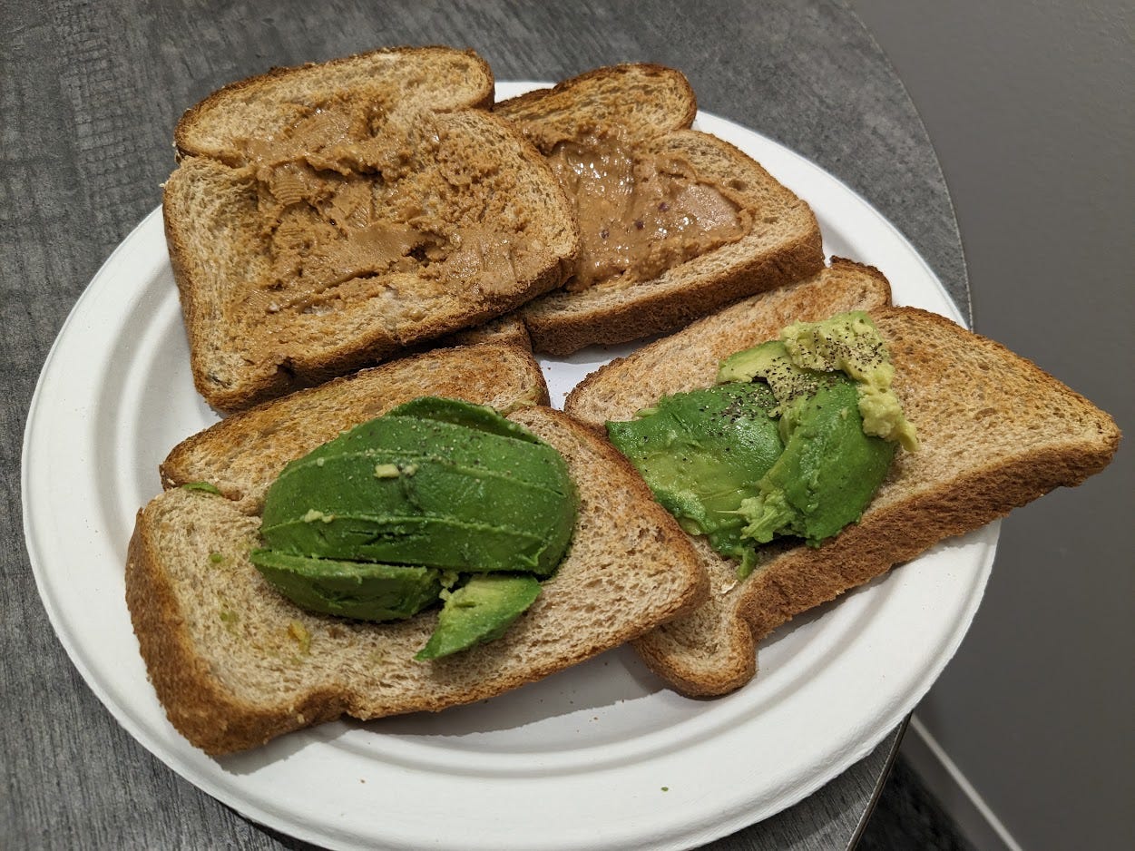 Peanut Butter and Avocado Toast Double-Double which I have shamelessly eaten for multiple office meals this week. It’s just avocado, salt & pepper on two slices of wheat toast, and peanut butter (I like Adams natural crunchy) on another two slices, but hits on many levels.
