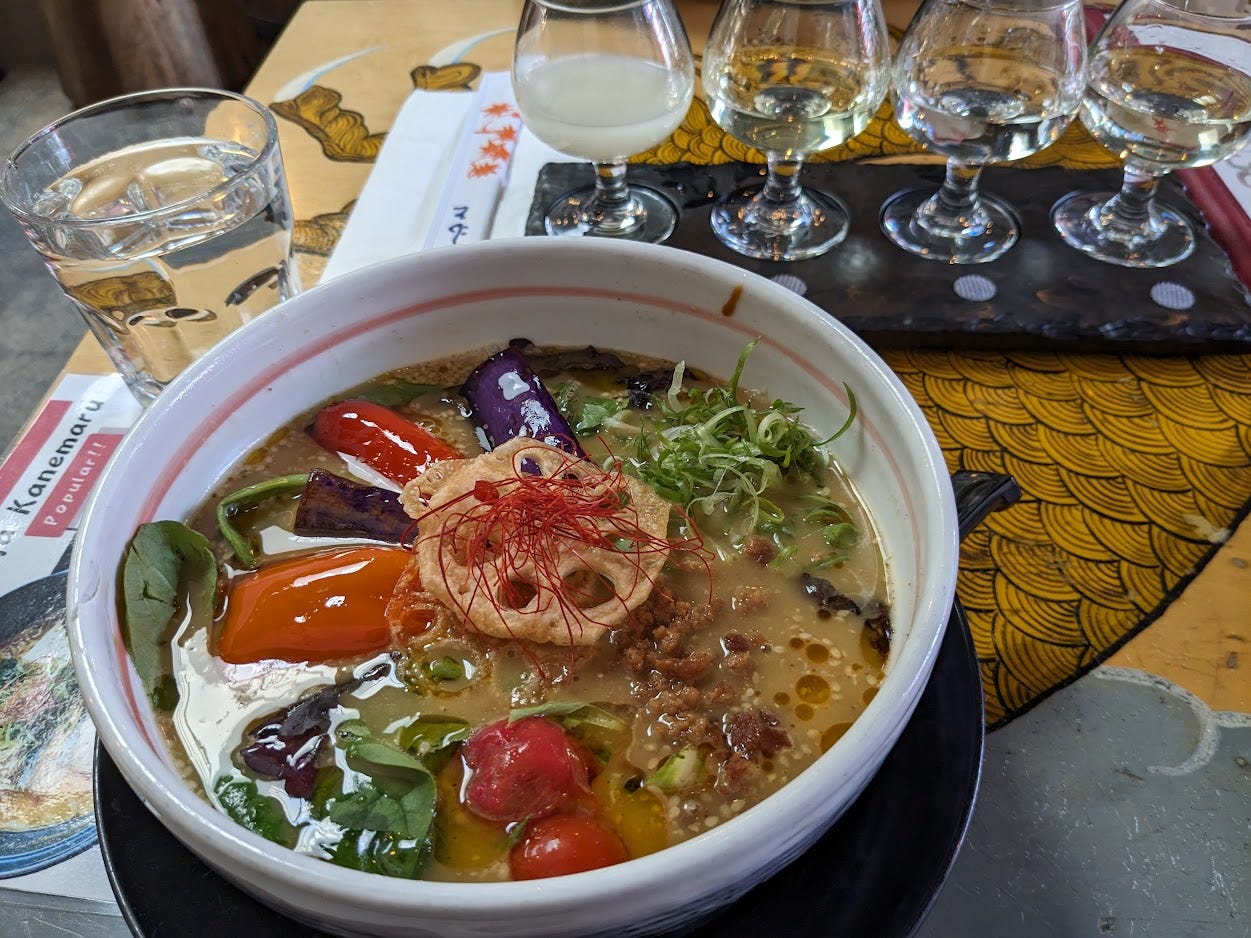 One day I decided to finally stop in for “late lunch early dinner”. There were only two other customers, both solo, which was about right for a mid-afternoon. I was promptly served and went for the sake flight to whet my appetite and the vegan curry miso ramen. Major points for having more than one vegan option.